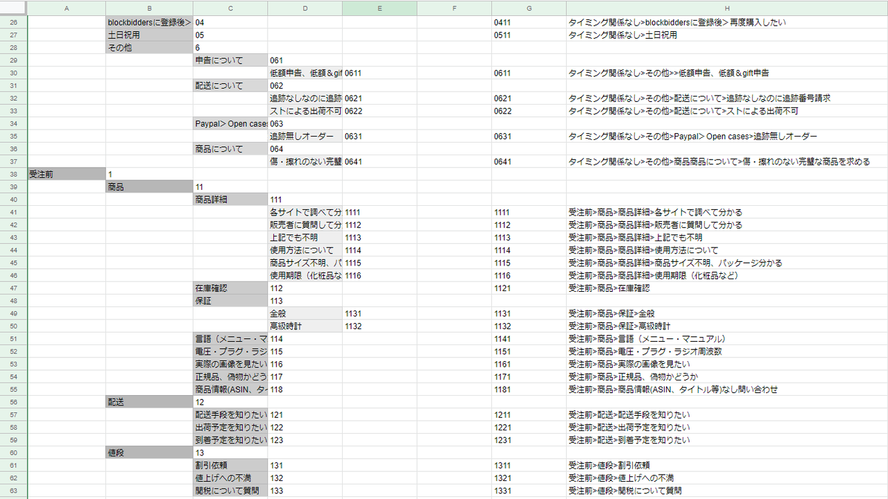 例えば、発送方法(FedExなのか、ePacketなのか等)、商品の不備、Return Requestへの対応等をできる限り事細かに分類しています。